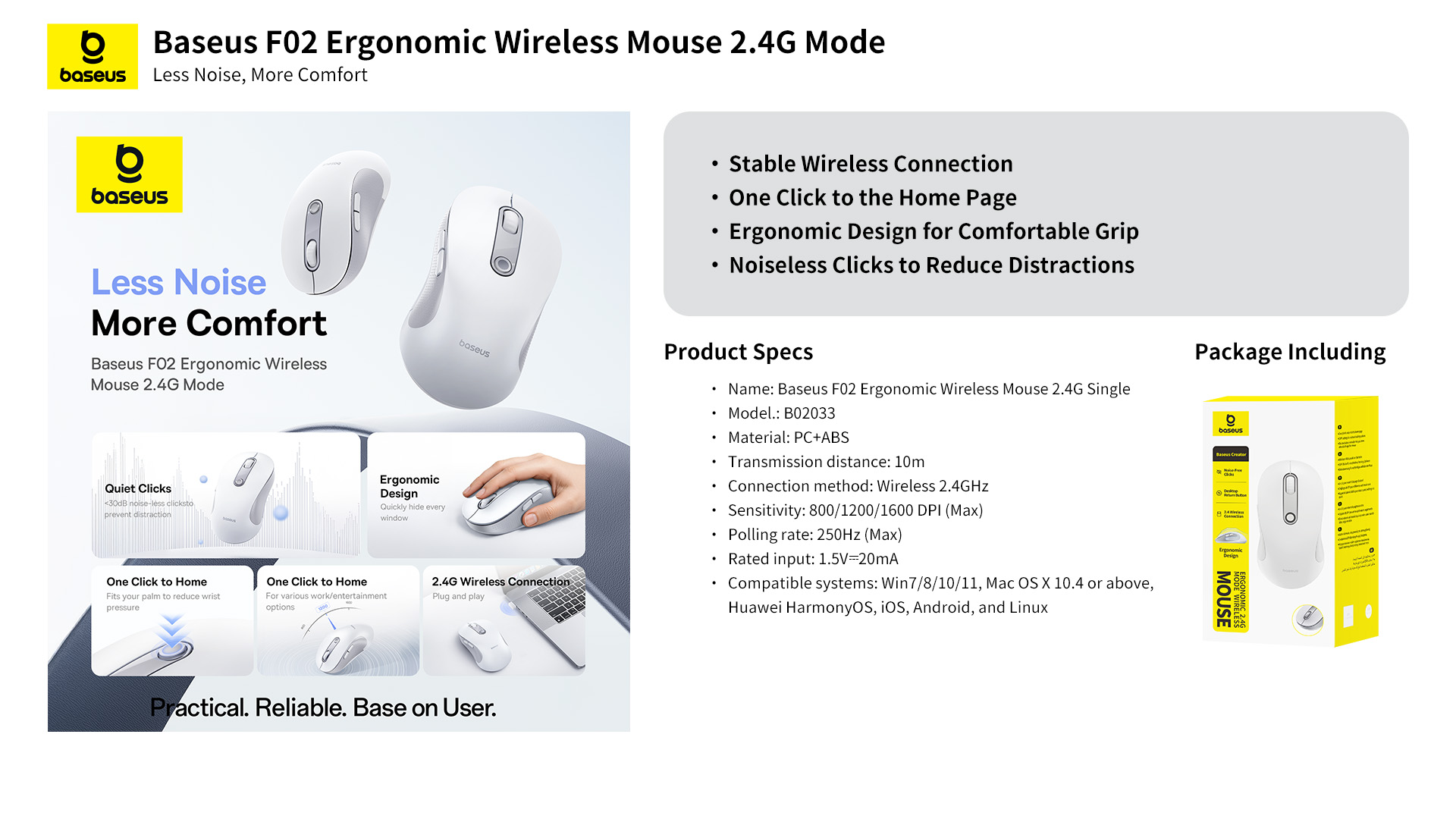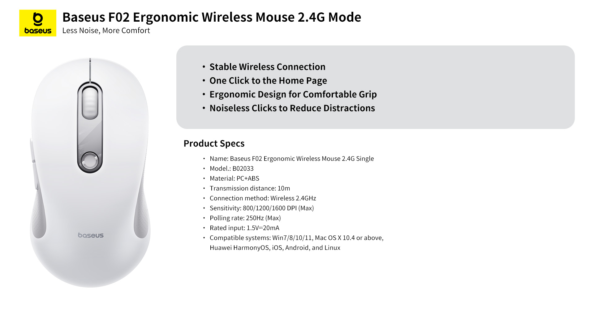 Беспроводная мышь Baseus F02 Ergonomic - это сочетание функциональности, удобства и стильного дизайна. Она станет незаменимым помощником для каждого пользователя, обеспечивая комфорт и продуктивность в работе и развлечениях.