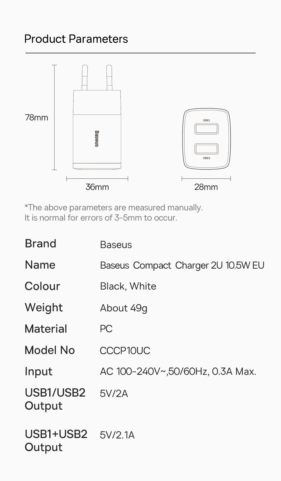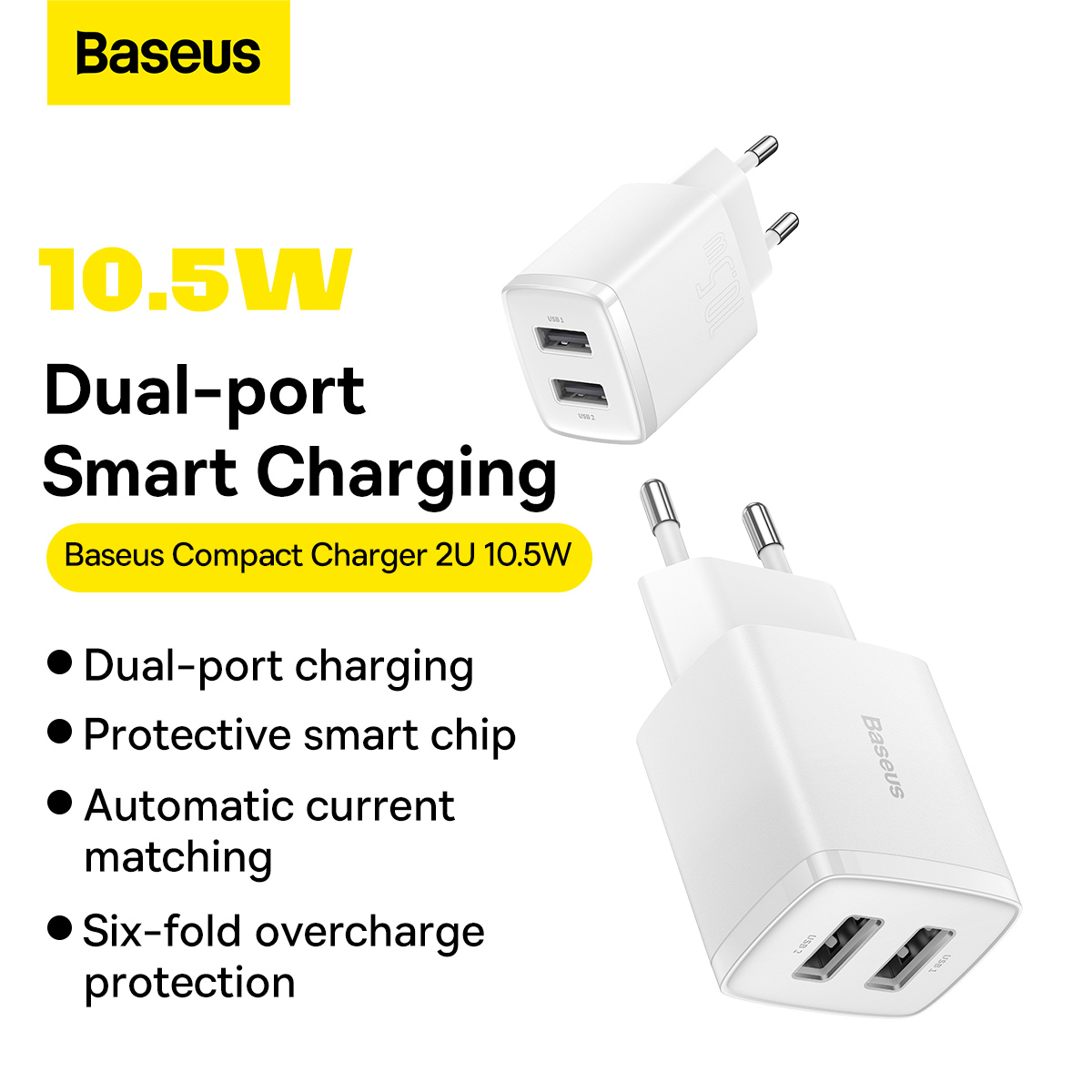 Сетевое зарядное устройство Baseus Compact 10.5W 2xUSB-A - это удобный, надежный и мощный аксессуар для зарядки ваших устройств.