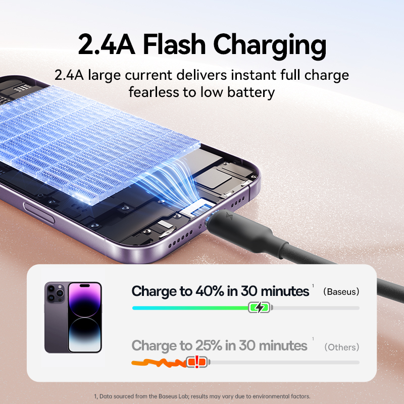 Кабель поддерживает быструю зарядку до 2.4A, что позволяет заряжать ваше устройство в несколько раз быстрее, чем при использовании стандартных кабелей.