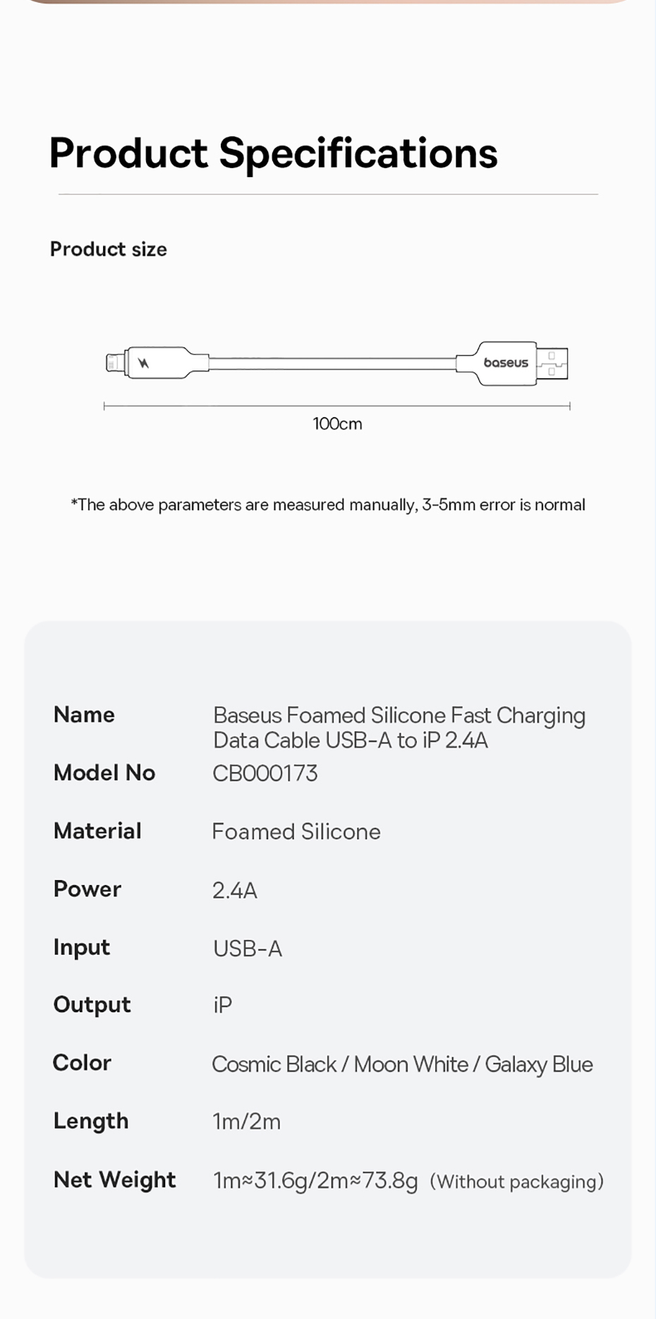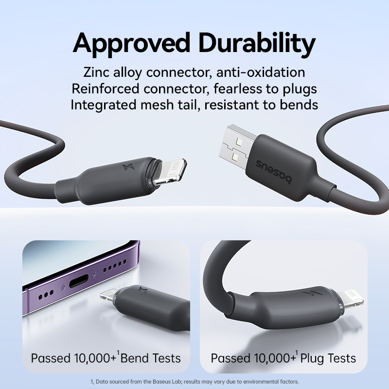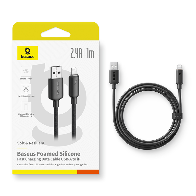 Кабель Baseus Foamed Silicone USB-A to Lightning 8pin, 2.4A (E0426900) выполнен в стильном черном цвете, который подойдет к любому устройству и аксессуару.