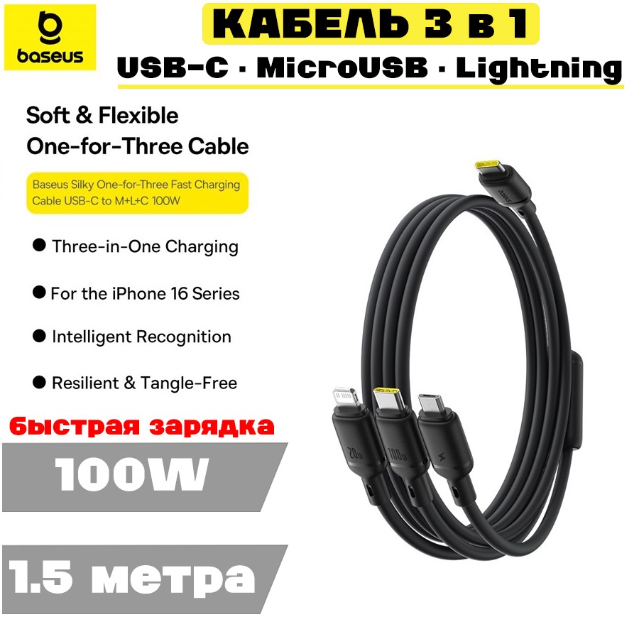 Кабель Baseus Silky 100W, 3 в 1 "быстрая зарядка" (P10377706123-00) 1.5 метра, черный