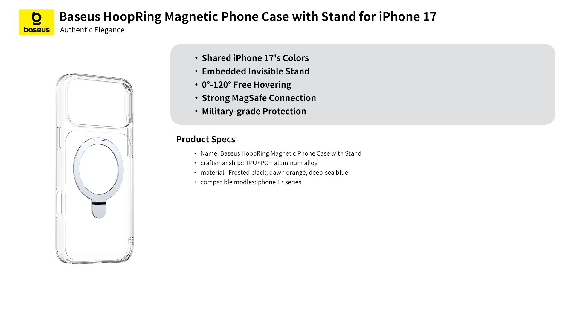 В целом, чехол-накладка Baseus HoopRing Magnetic для iPhone 17 (P0046000) - это отличный выбор для тех, кто ценит стиль, функциональность и надежность.