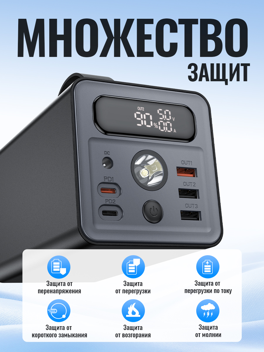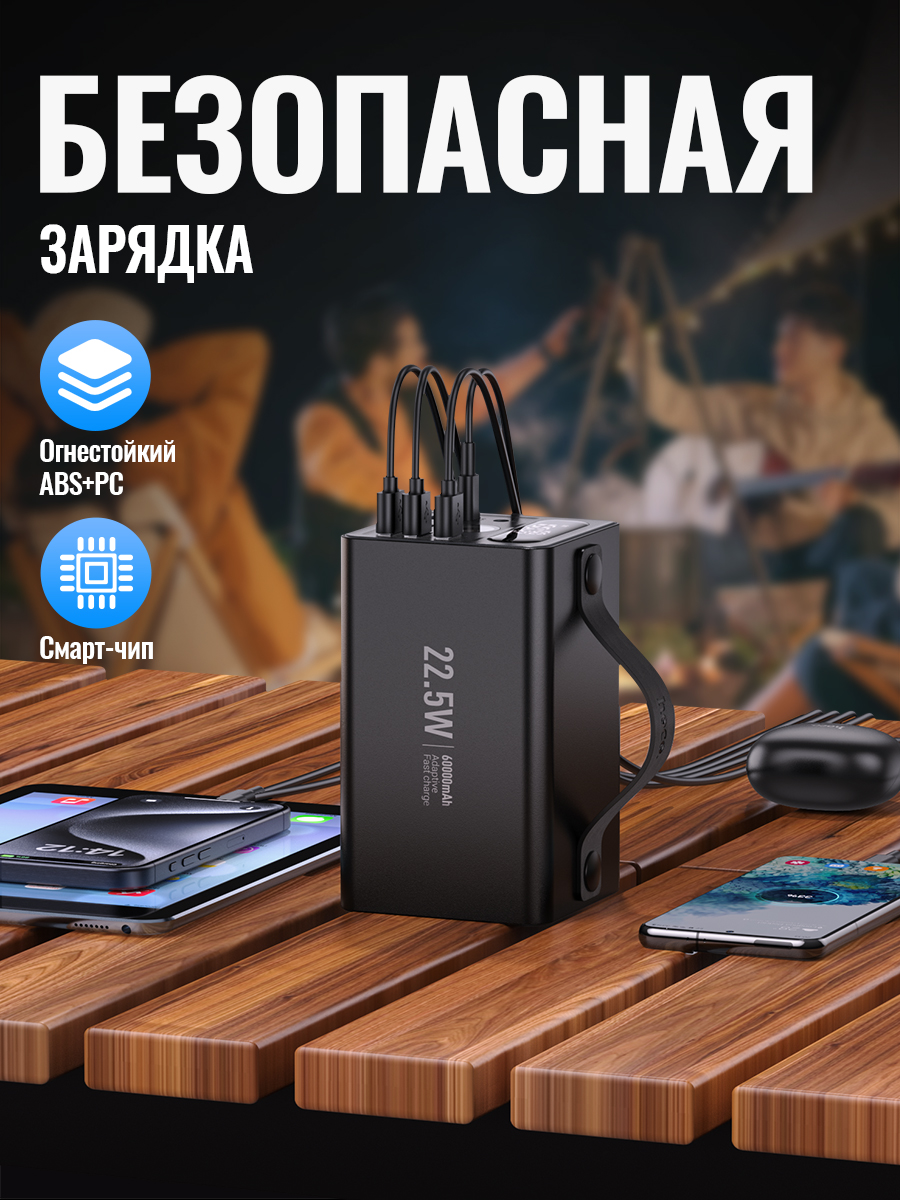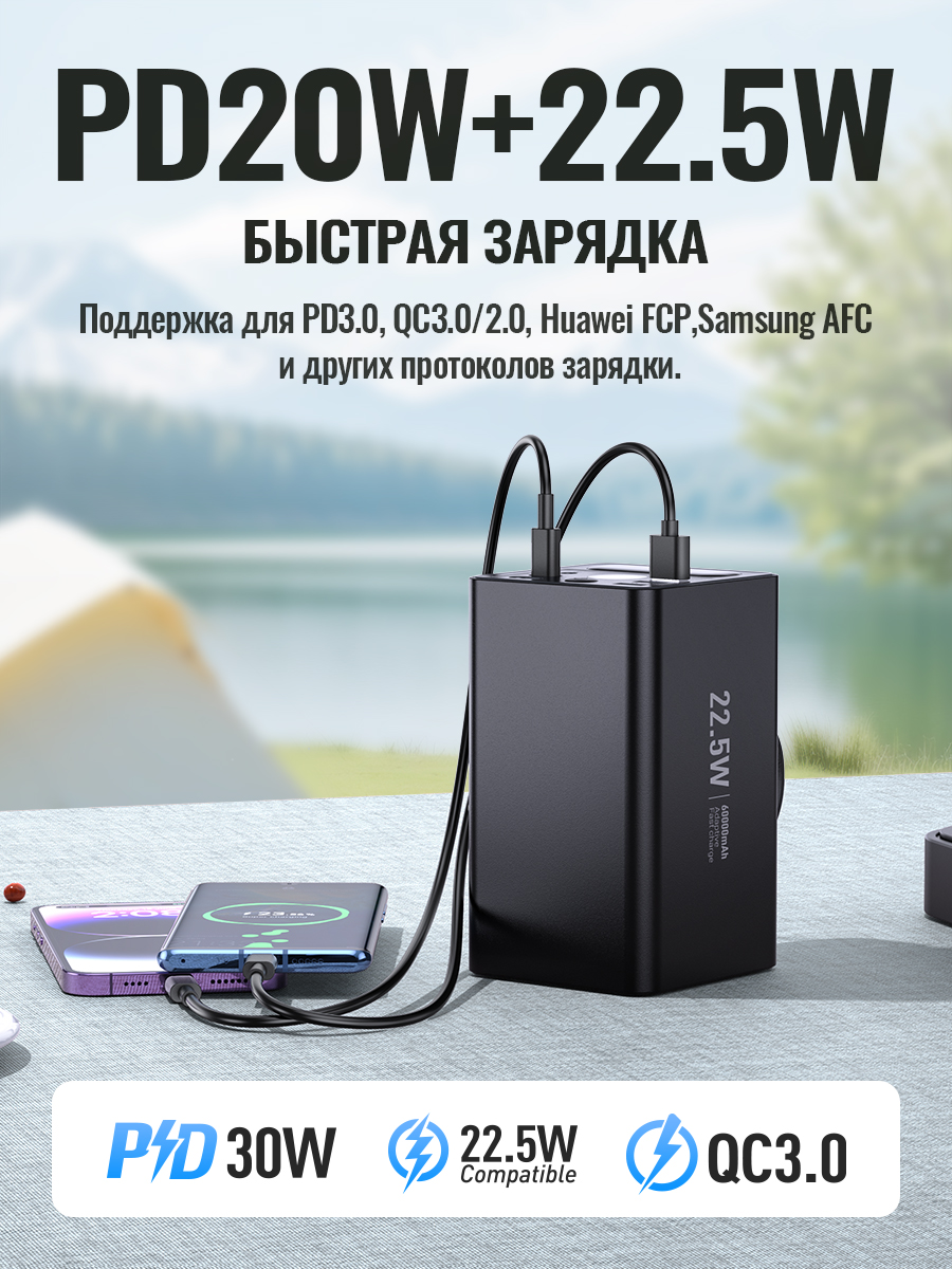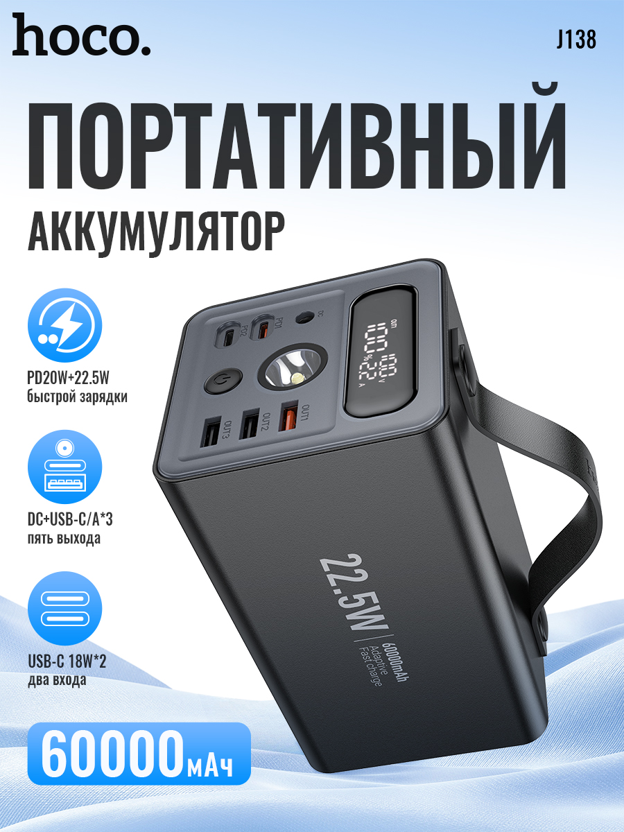 Повербанк HOCO J138 60000 mAh - это портативное устройство, которое обеспечивает быструю зарядку ваших устройств. С его помощью вы сможете зарядить свой смартфон, планшет или другое устройство в любое время и в любом месте.