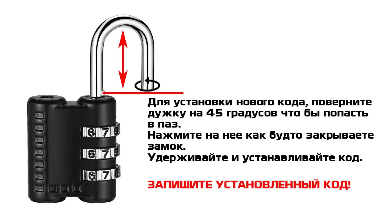 ВНИМАНИЕ: При смене кода дужку замка необходимо ДЕРЖАТЬ в пазу до упора. Чаще всего неправильная переустановка кода является причиной некорректной работы замка (заклинило, не открывается, код не работает и т.д.). Также, не забудьте записать пароль – без установленной комбинации открыть замок возможно только перебрав все возможные варианты цифр.